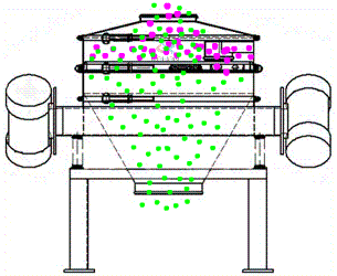 直排篩由進(jìn)料口、防塵蓋、電機(jī)、彈簧、出料口組成。兩臺(tái)型號(hào)相同的振動(dòng)電機(jī)對(duì)稱安裝在篩機(jī)兩側(cè),振動(dòng)電機(jī)上、下端裝有偏心重錘,通過改變上下偏心塊的相位角和重量,可以改變激振力的大小和物料的運(yùn)動(dòng)軌跡,進(jìn)而達(dá)到篩分各種物料的目的。